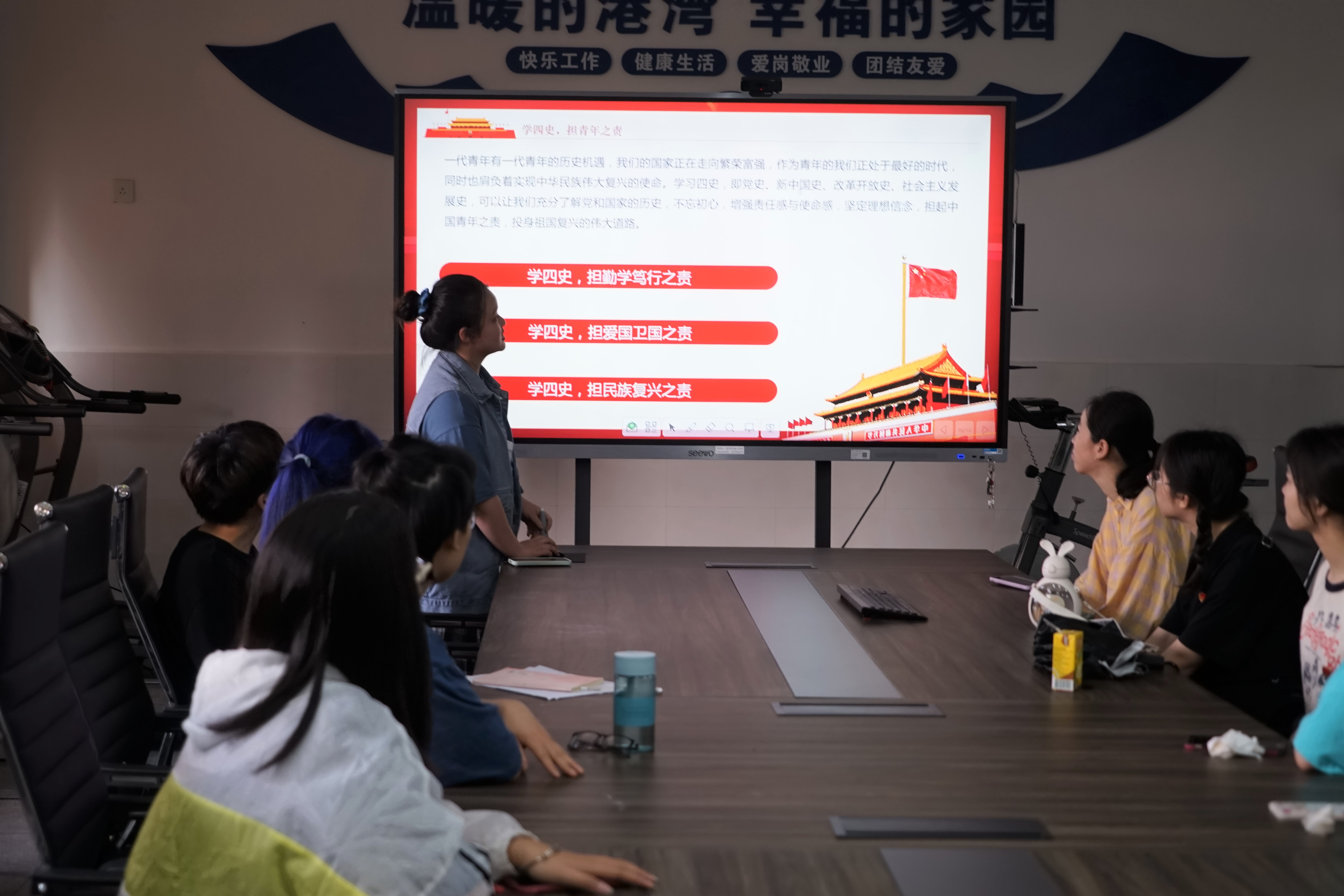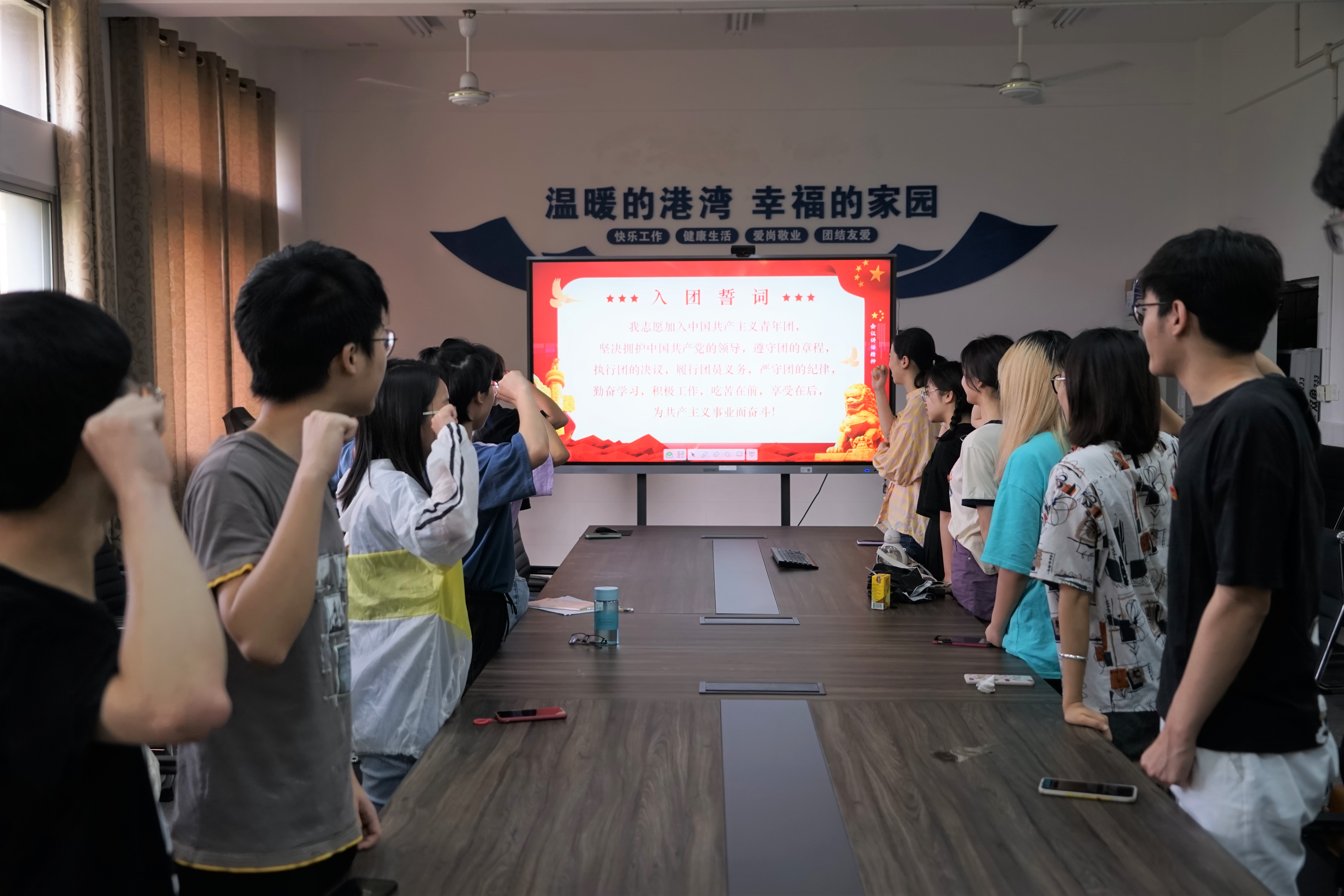 在宣誓和唱团歌之后,团支书上台进行总结:时代不一样,但中国青年一样。我们应该为了这个社会、这个国家、这个时代,心存信念、不断前行。